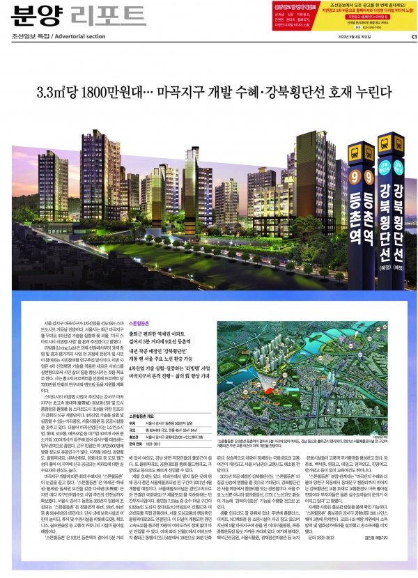 | [조선일보] 3.3㎡당 1800만원대 ··· 마곡지구 개발 수혜·강북횡단서 호재 누린다 | |||